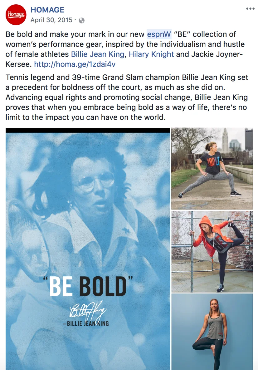 The rub: First and foremost, HOMAGE’s marketing team needed to concept, create and deliver all assets in an unbelievably abbreviated timeline. From a copy perspective, the collection and campaign were deceivingly layered. They needed to tell three distinct yet universal stories that grew out of and paralleled each of the superstars' narratives. Those three stories then had to come together to form a singular, overarching message. And finally, while we would be spotlighting athletes who defied the odds to make their presences known on the world’s stage, the collection needed to excite and empower females of every background, age and interest. It needed to appeal and connect with the shy teenager uncomfortable at the thought of making waves in classroom, the confident trailblazer-in-training who knew her legend would outlive her or the mom wanting to shake up her routine.